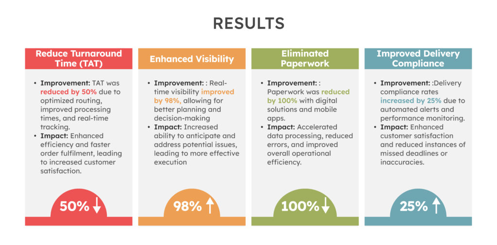 - Performance Monitoring: Implemented performance monitoring tools to track delivery performance, compliance metrics, and customer feedback. This enabled continuous improvement based on actionable insights.
